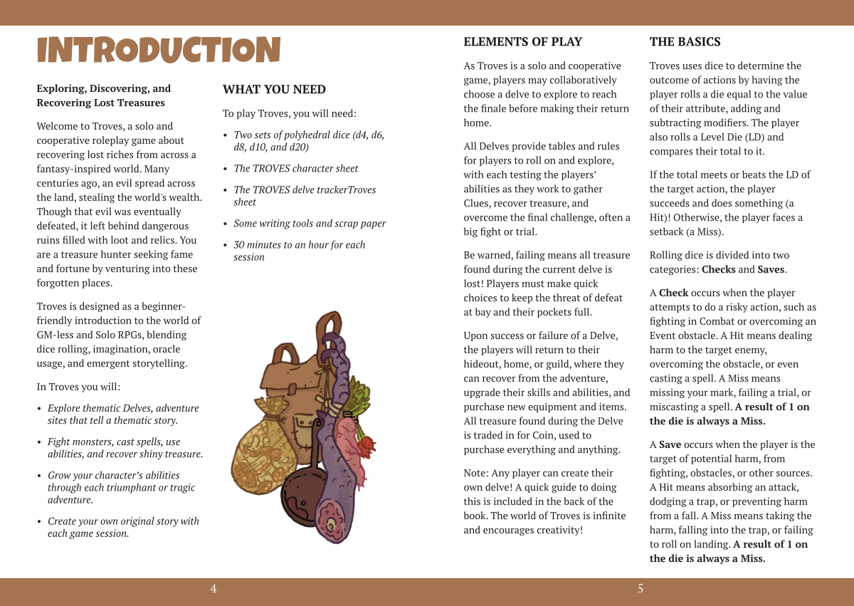 Welcome to Trove 2e, a lighthearted solo and cooperative roleplaying game of exploring, discovering, and recovering lost treasures from across a fantasy inspired world. In Troves you will: