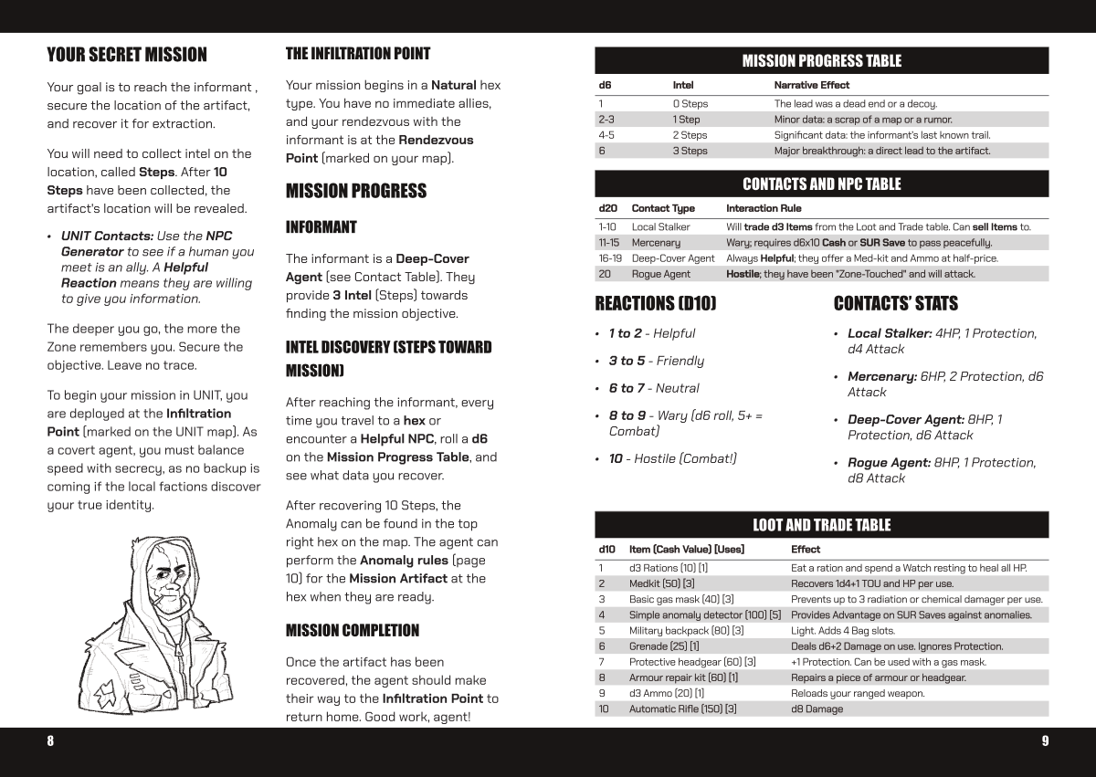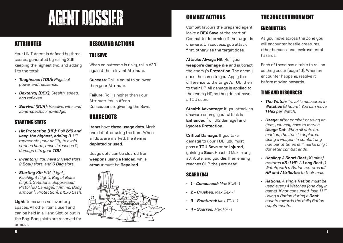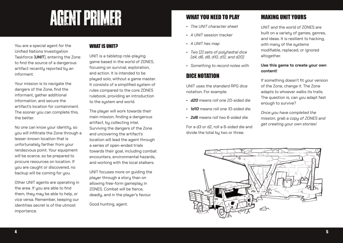 UNIT is a tabletop role-playing game based in the world of ZONES, focusing on survival, exploration, and action. It is intended to be played solo, without a game master. It consists of a simplified system of rules compared to the core ZONES rulebook, providing an introduction to the system and world.